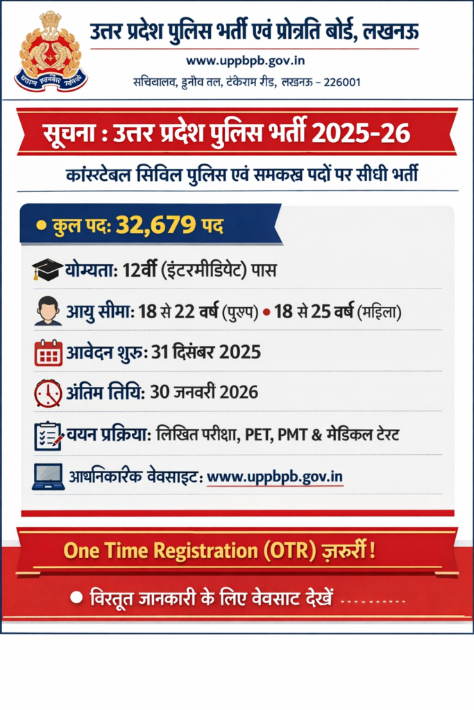 उत्तर प्रदेश पुलिस भर्ती एवं प्रोन्नति बोर्ड (UPPRPB) ने उत्तर प्रदेश पुलिस कांस्टेबल और समकक्ष पदों पर **कुल 32,679 पदों की सीधी भर्ती के लिए अधिसूचना जारी कर दी है।