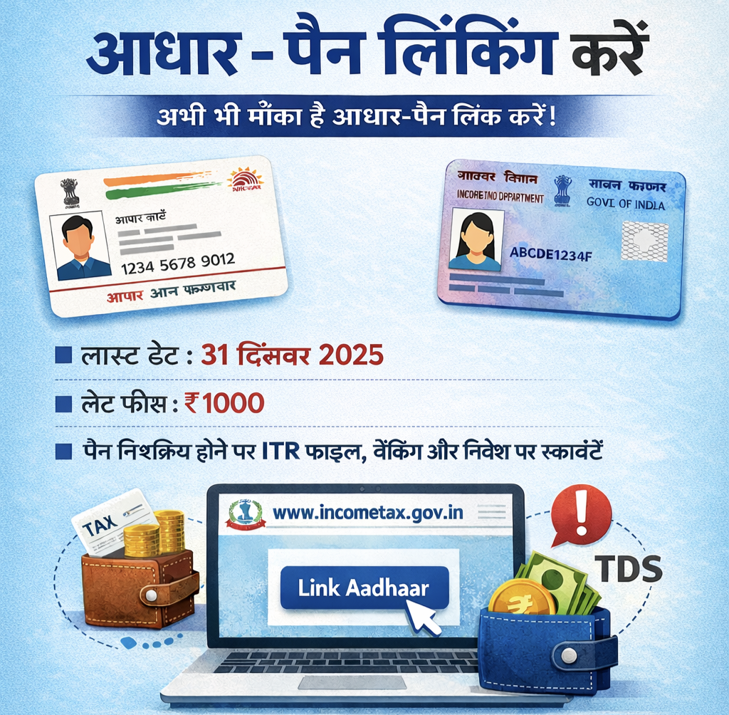 अगर आपने अभी तक आधार–पैन लिंक नहीं कराया है, तो बिना देरी के इनकम टैक्स पोर्टल पर जाकर प्रक्रिया पूरी करें, ताकि भविष्य में टैक्स, बैंक और निवेश से जुड़ी किसी भी परेशानी से बचा जा सके।